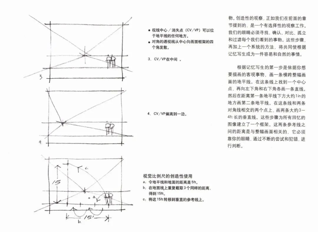 根据记忆写生的第一步是依据你想要描画的客观事物,画一条横跨整幅画面的地平线,在这条线上找到一个中心点,再向左下角和右下角各画一条直线,然后在距离第一条地平线下方大约1in的地方画第二条地平线。在这条线和两条对角线相交的两个点上,画两条大约3~4ft长的垂直线。这些步骤为所有回忆的图像建立了一个框架。