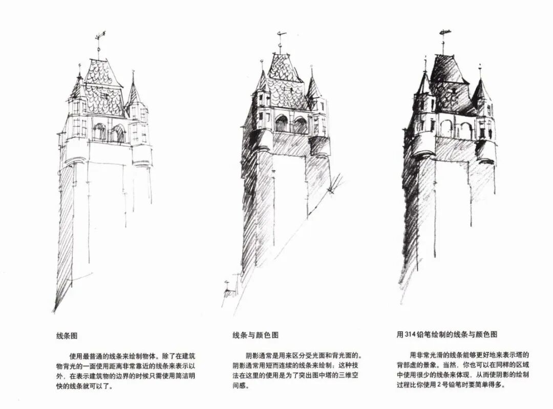 一定要记住纹理和样式在刻画建筑物时是占有很重要的位置的,样式被用来表现建筑材料和建筑的方法,大多数的式样是由各种方向的连续线条构成的从平行线到交叉线画出的阴影,并保留一些明显的白色平面作为对比,使得画面显得生气勃勃。还可以使用浓重的阴影以凸显空间的深度感,并且可以提高所画物体的可视性。