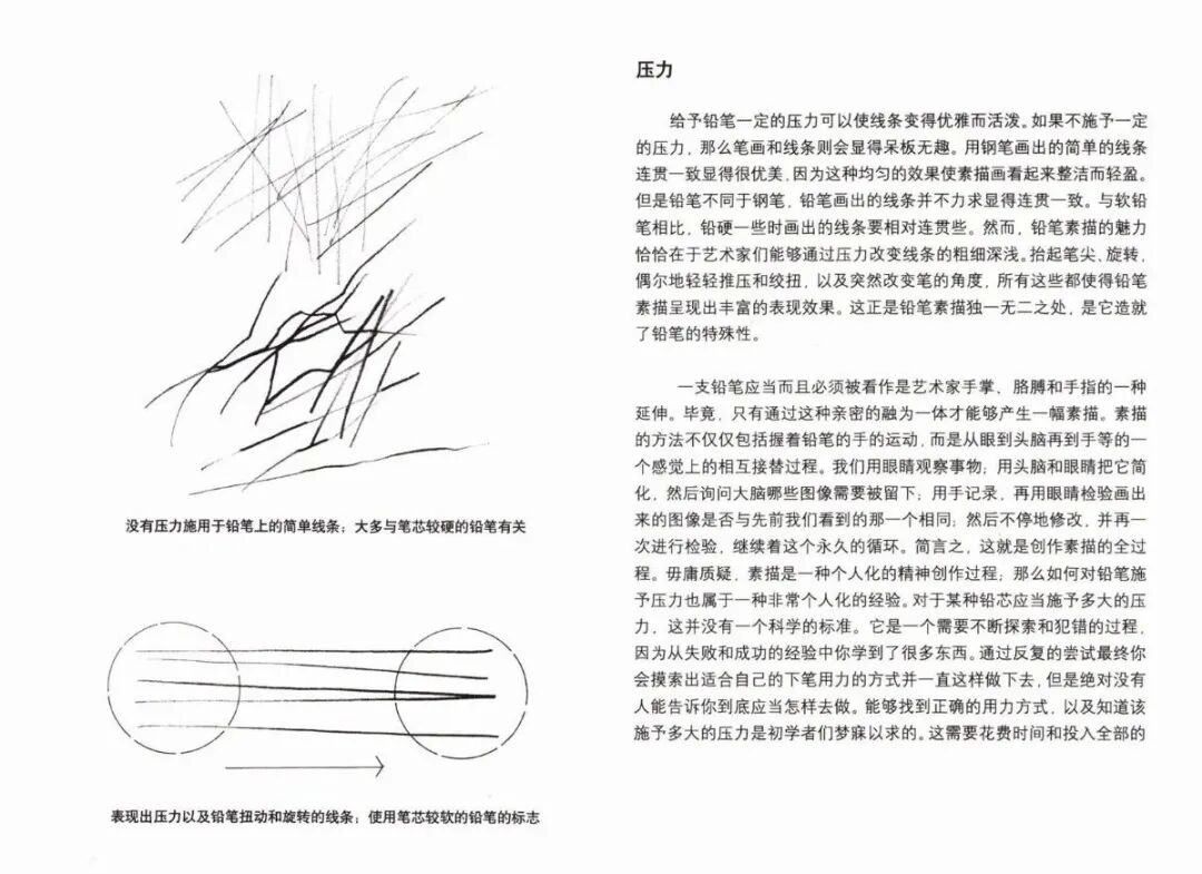给予铅笔一定的压力可以使线条变得优雅而活泼。如果不施予一定的压力,那么笔画和线条则会显得呆板无趣。铅笔素描的魅力恰恰在于艺术家们能够通过压力改变线条的粗细深浅,抬起笔尖,旋转,偶尔地轻轻推压和绞扭,以及突然改变笔的角度,所有这些都使得铅笔素描呈现出丰富的表现效果。这正是铅笔素描独一无二之处,是它造就了铅笔的特殊性。