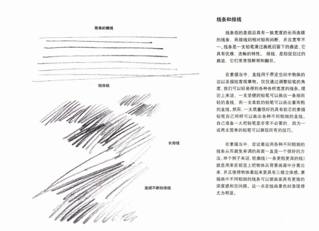 线条指的是前后具有一致宽度的长而连续的线条,而排线则相对短而间断,并且宽窄不一。线条是一支铅笔滑过画纸后留下的痕迹,它具有优雅流畅的特性。排线是短促划过的痕迹,它们常常很鲜明和醒目。