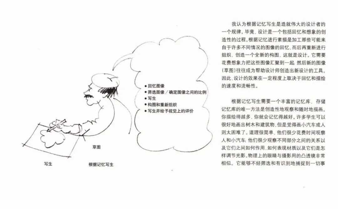 根据记忆写生需要-个丰富的记忆库,存储记忆库的唯一方法是创造性地观察和随时地描画。描绘得越多,你就会记忆得越好。回忆图像;筛选图像/确定图像之间的比例;写生;构图和重新组织;写生并给予视觉上的评价