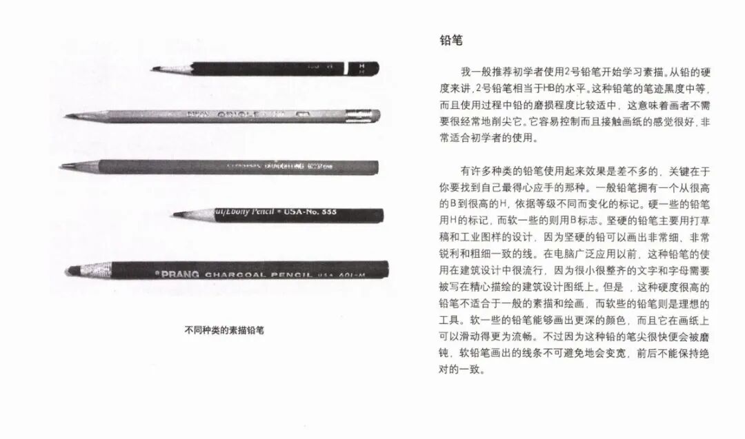一般推荐初学者使用2号铅笔开始学习素描。从铅的硬度来讲,2号铅笔相当于HB的水平,这种铅笔的笔迹黑度中等,而且使用过程中铅的磨损程度比较适中,这意味着画者不需要很经常地削尖它。它容易控制而且接触画纸的感觉很好,非常适合初学者的使用。