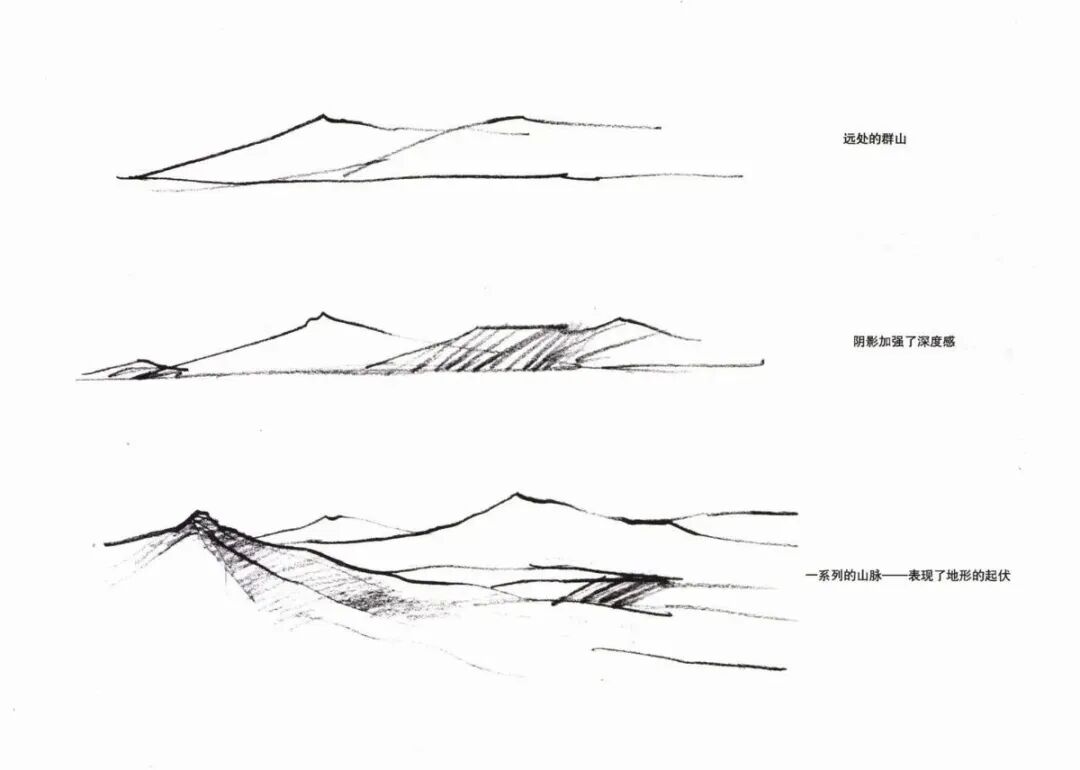 地形地貌由山川、峡谷和有一些裸露岩石的平原组成,这些元素不会单独出现在景观中,而是和其他一个或多个元素共同出现。这些元素的结合使得画面显得更加有情趣,而且使得图像成为更好的素描主题,它们创造了更多的层次从而得到一个更加引人入胜的构图。