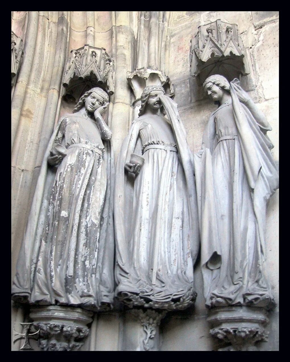 《三位聪明的女孩和三位愚蠢的女孩》的出现是出人意料的,雕像中人物极其夸张的表情被认为是中世纪哥特式雕塑里最空前绝后的,它借助世俗性来体现教育的寓意,与前面介绍的《艾克哈特与尤塔雕像》等捐赠者之像的高贵节制有着明显的不同,这种极力表现人性的艺术作品只有到了15世纪后的文艺复兴才大量出现在宗教题材中。