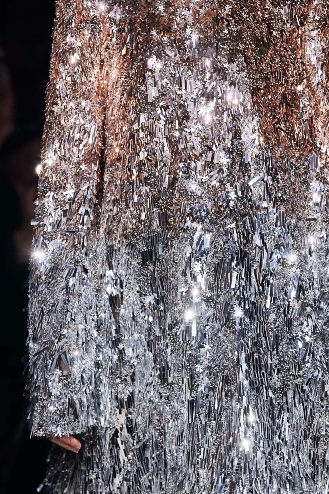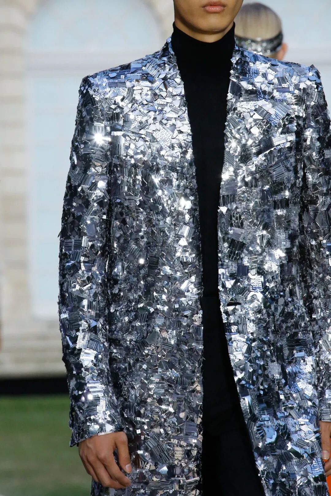 她的男装也很厉害。这件外套远看像是细密的碎片镜子组成(过去Christopher Kane和Roberto Caballi也用过镜子元素),仔细看才发现是银色系的亮片全手工一点一点缝纫。