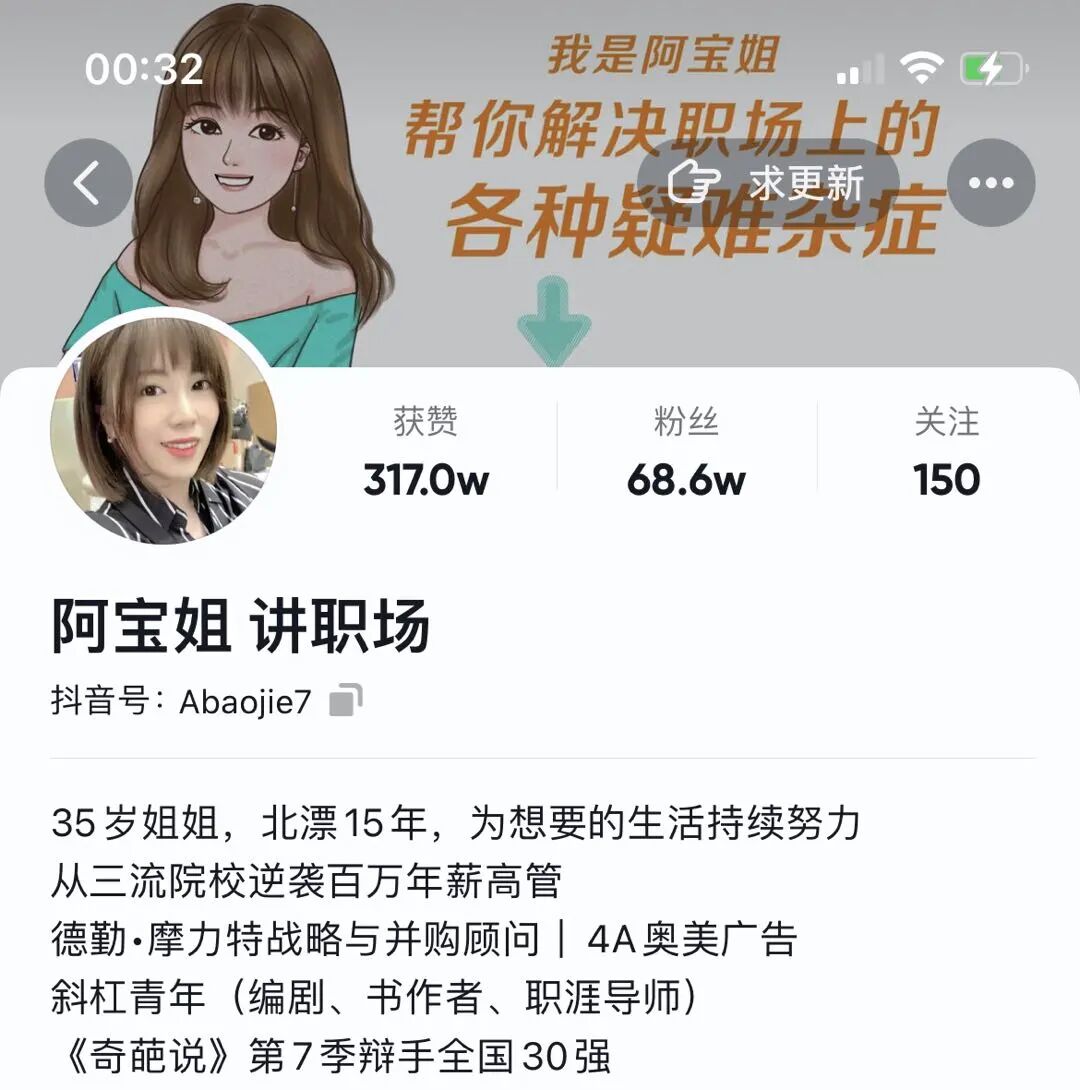 工作之余,阿宝姐经常在抖音、知乎、公众号等平台跟大家分享一些职场经验,没想到很快就聚集了近70W粉丝。