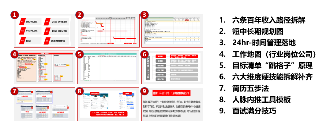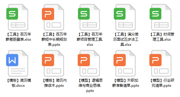 (职业规划表+逻辑思维与商业思维架构表+简历模版+内推话术+面试五步法工具+升职加薪准备清单)