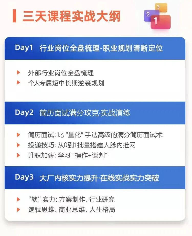 另外还会送你3天职业生涯规划直播课,让主讲老师为你定制职业规划。课程是免费的,实打实的福利,名额有限,大家千万把握