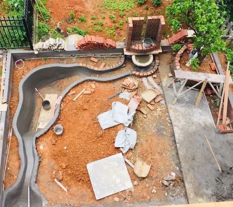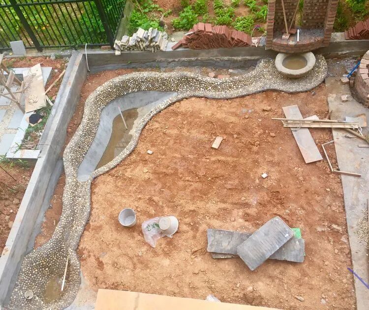 我觉得老公有老师喜欢讲道理的风格,也秉持着我欣赏他行动派的风格,将画在纸上的设计草图一步一步实现,老公审美水平很高,特别注重动静、虚实、阴阳、干湿结合,园内分为五个区域:原始森林背景、莲花佛系、石磨小径草原、玻璃栈道、油麻藤露台。