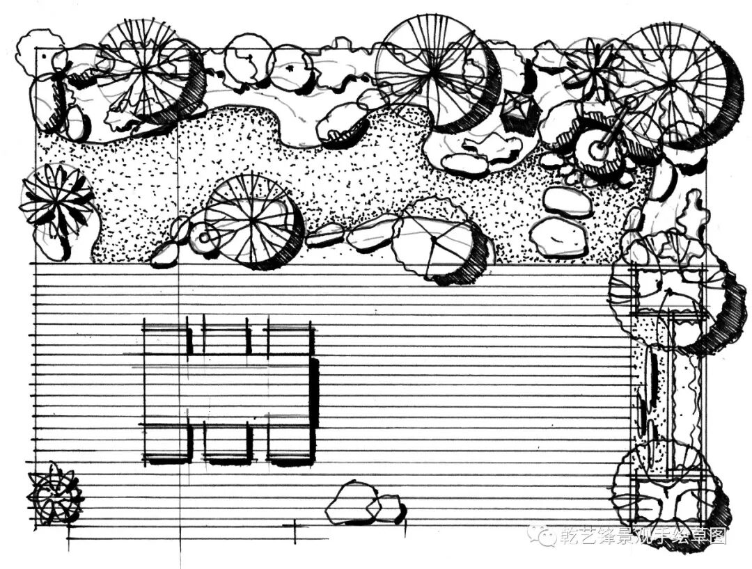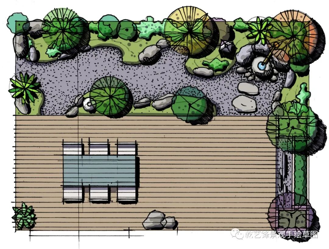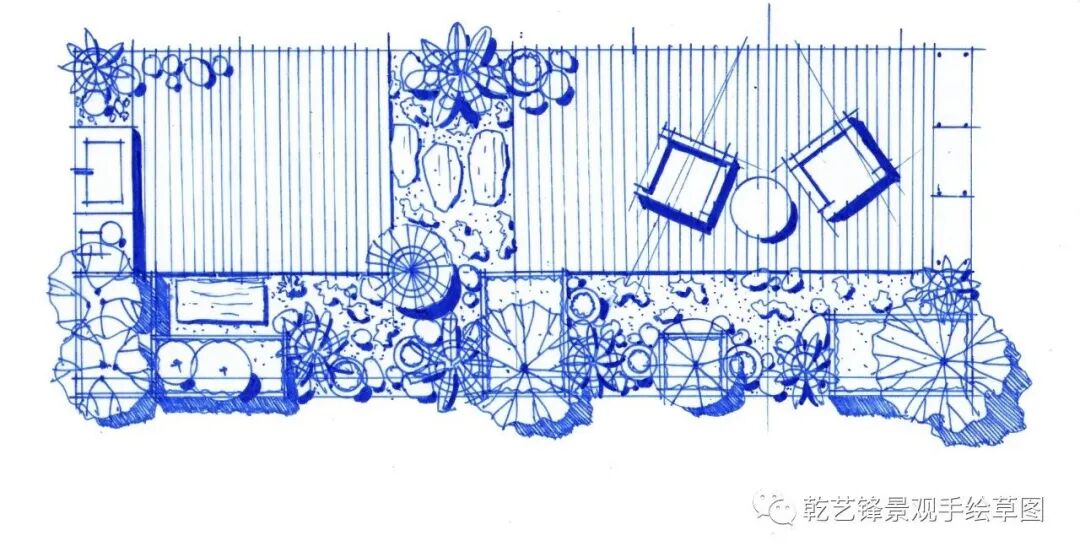 第一个露台用蓝笔+尺子,画完平台和种植池后,其他用徒手方式表现。这张图只花了2小时不到。