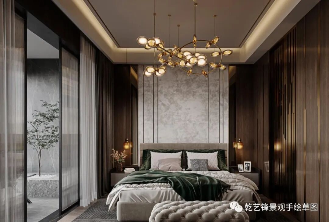 由于整体室内装修风格偏新古典主义轻奢,露台又离主卧非常近,打开卧室门就是露台,业主希望能够主卧风格和室外露台相搭。