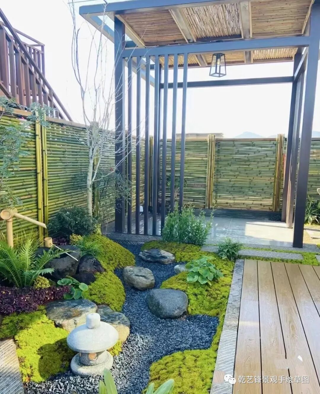 所以我认为六楼主卧露台可打造偏现代风格的花园。业主虽然接受这种想法,但希望可以弄些区域给她老婆养多肉植物,而七楼结合茶室属于他自己喜欢的日式禅意风格区域,可以用来招待朋友客户等。