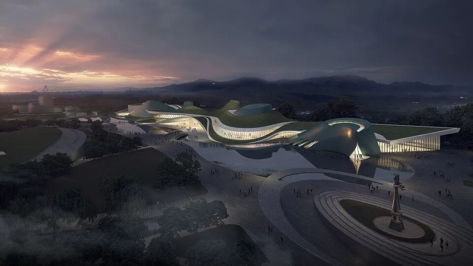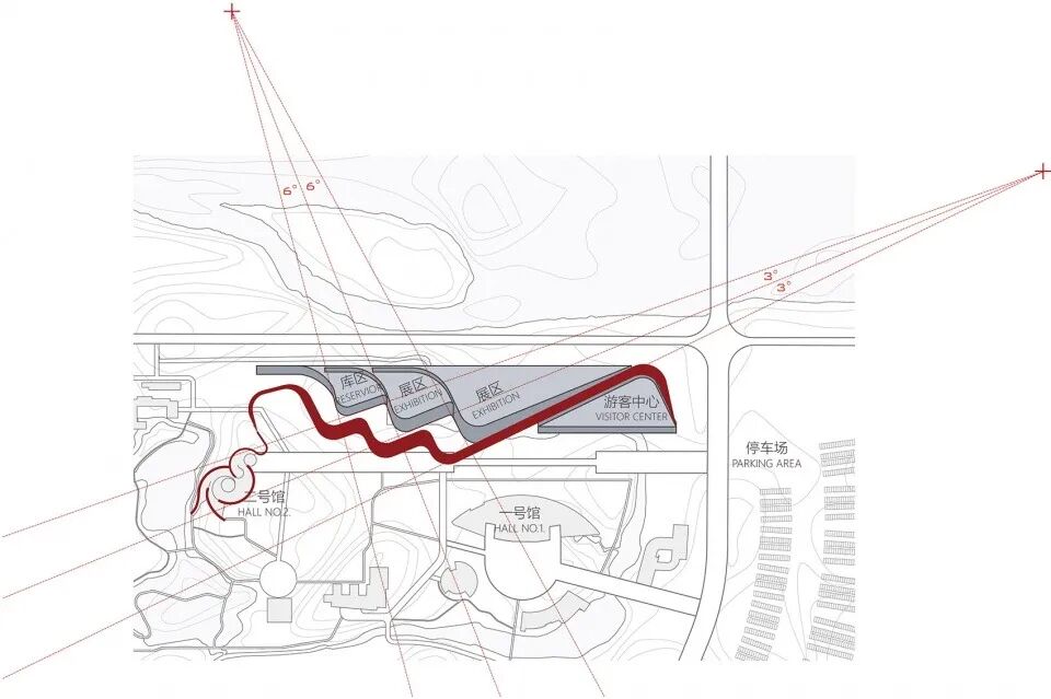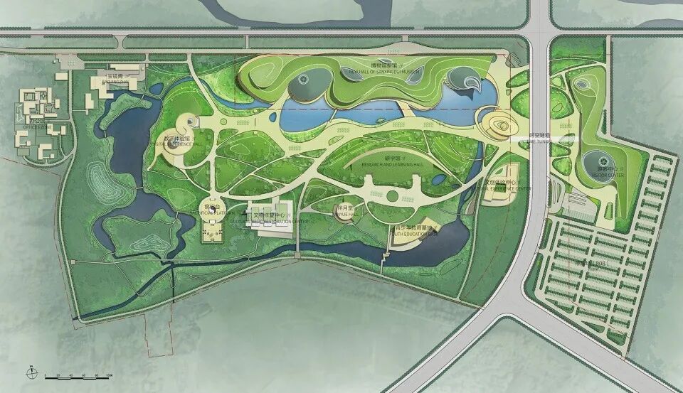 博物馆选址于遗址公园内,我们遵循历史遗址类博物馆设计的原则,针对三星堆遗址公园的现有环境和古蜀文化的特色,在设计中着重思考以下三个问题: