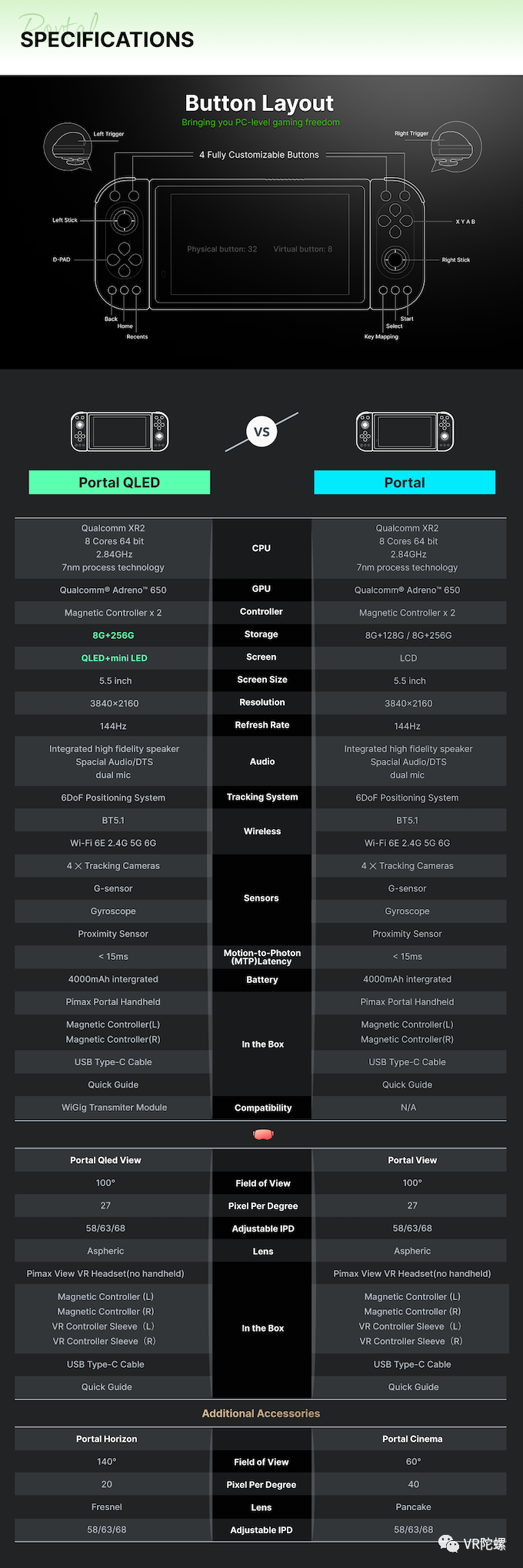 599 美元,包含一个 8GB+256GB 的手持式 Pimax Portal QLED 版+USB Type-C 数据线+View VR 头显 Pro (后置 6000 毫安电池)+VR 控制器套件;