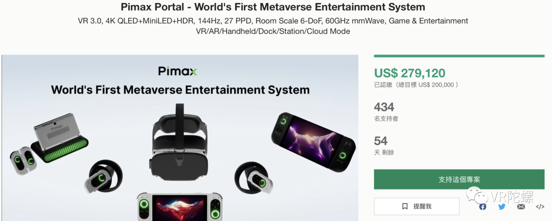 小派科技 VR3.0 新品 Pimax Portal 从 11 月 15 日上架众筹平台 kickstarter 一周以来,截止 11 月 21 日上午,该产品已获得 434 名支持者,累计获得 279,120 美元众筹金额,达成 20 万美元众筹目标。