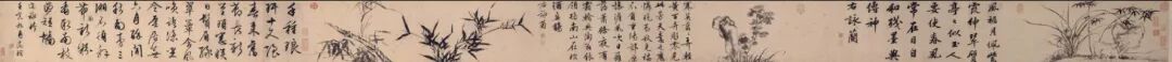 本幅款署:“壬寅九月徵明。”另有清内府藏印多方。此手卷画兰、菊、竹三段,各有文氏亲笔题咏。