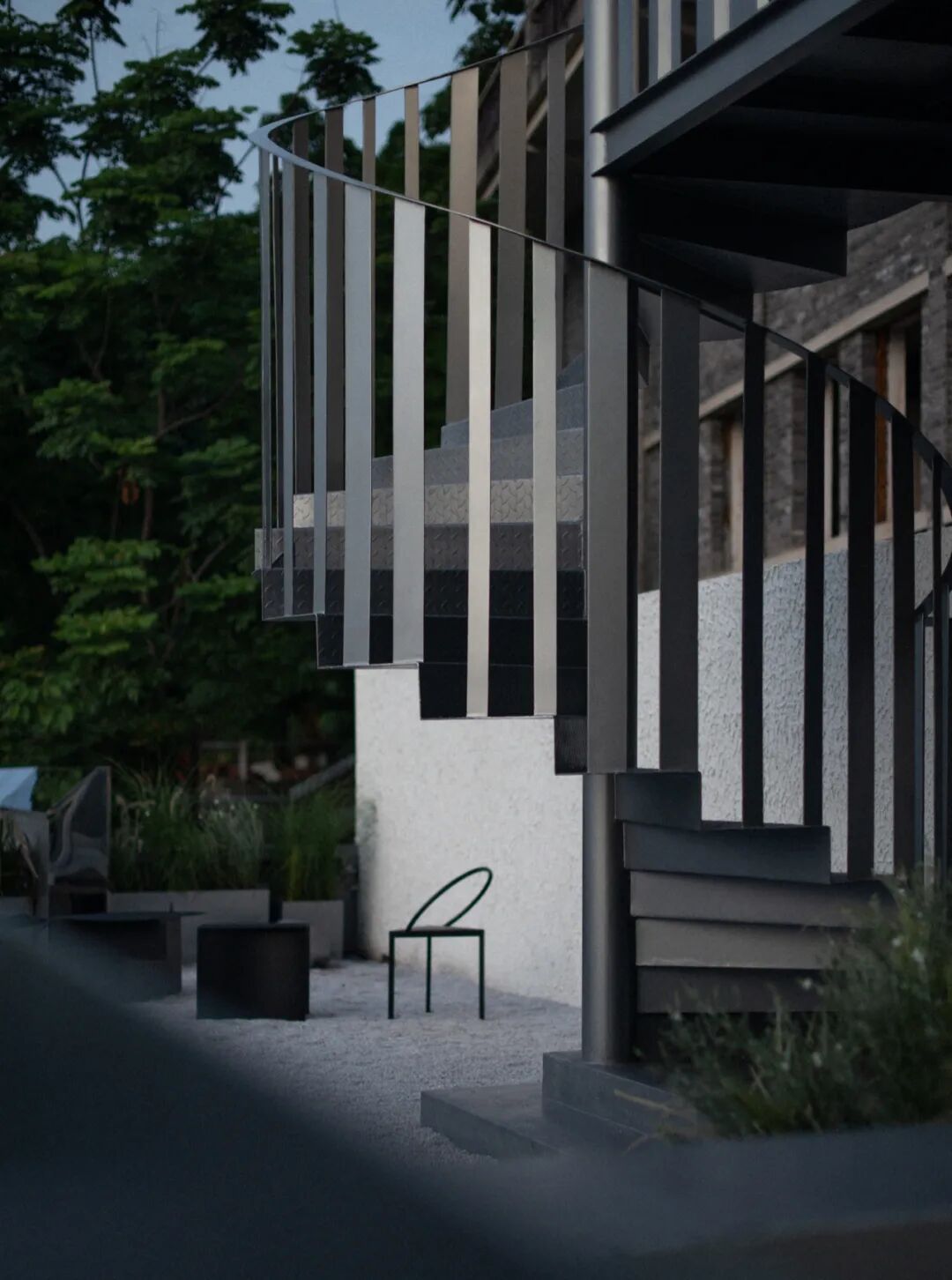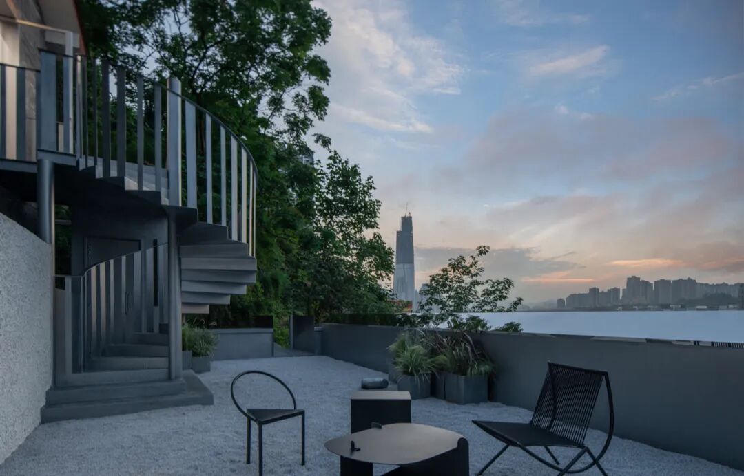 在最初的选址中,这里只有山顶马路边的一层小屋和半山的二层老房子,分为三个标高,之间靠室外的山道相连,破碎而割裂。设计首先通过串联屋顶露台的方式重新为项目打造更加高效的垂直交通。顾客无需经过漫长的室外山道,从山顶咖啡厅便可通过新建楼梯直达半山的中古店,途中还可以在屋顶露台欣赏重庆江景。半山小屋内也局部打通成一个垂拔空间,由此,顾客的动线是独立于室外环境,在室内完成了上山下山的过程。