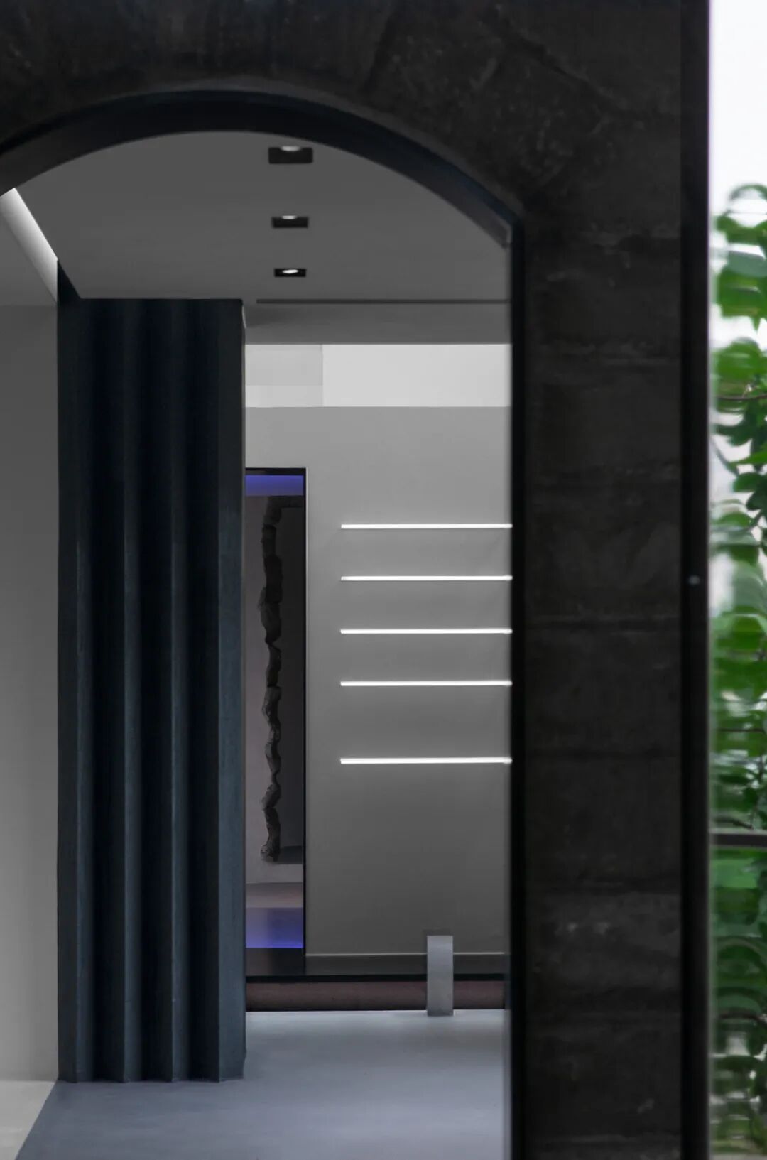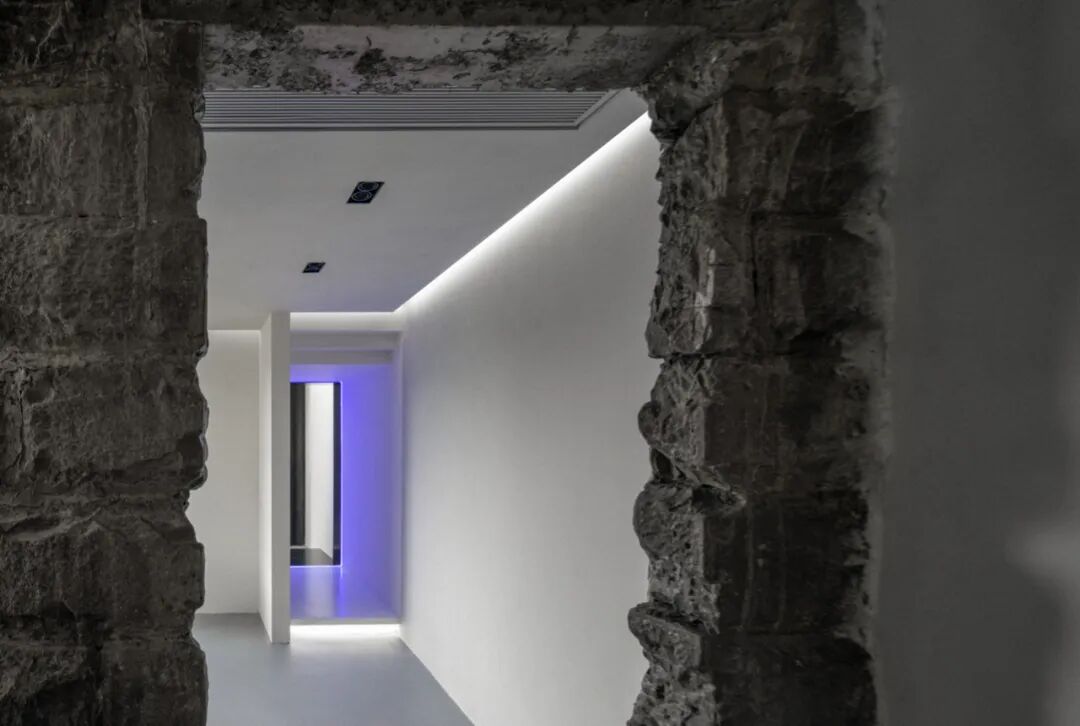 在立面改造上,设计选择了一种消隐的策略。老屋绝大部分的原始立面得以保留,在入口处加建出7米高的镜面体如同扭曲了此处的时空,使老屋的一角消失在半山之中。又仿佛一座连接中古时空的镜门,镜门上反映出周边环境的四季变化,则表达了一种关于中古的时间隐喻。