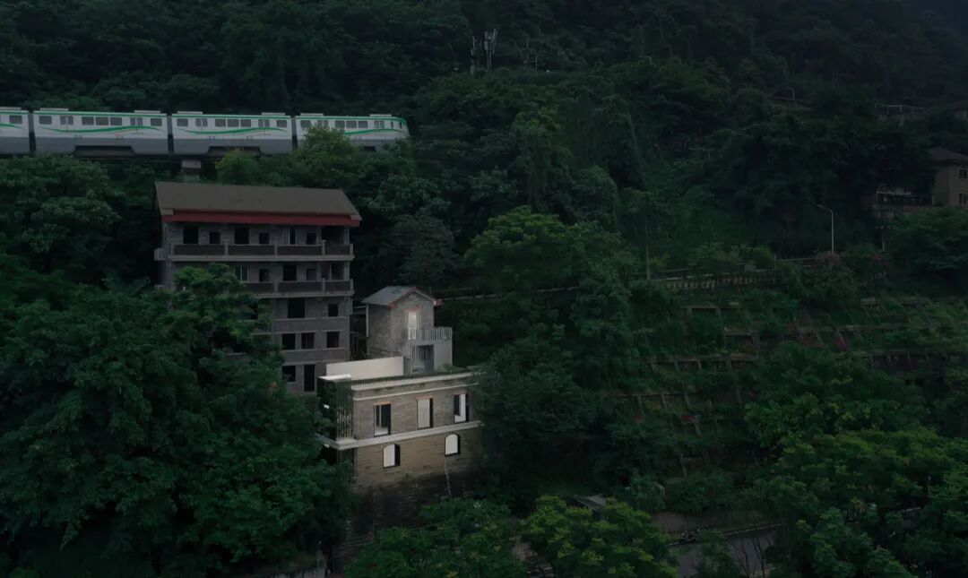 设计首先通过串联屋顶露台的方式重新为项目打造更加高效的垂直交通。在立面改造上,设计选择了一种消隐的策略。老屋绝大部分的原始立面得以保留,在入口处加建出7米高的镜面体如同扭曲了此处的时空,使老屋的一角消失在半山之中。