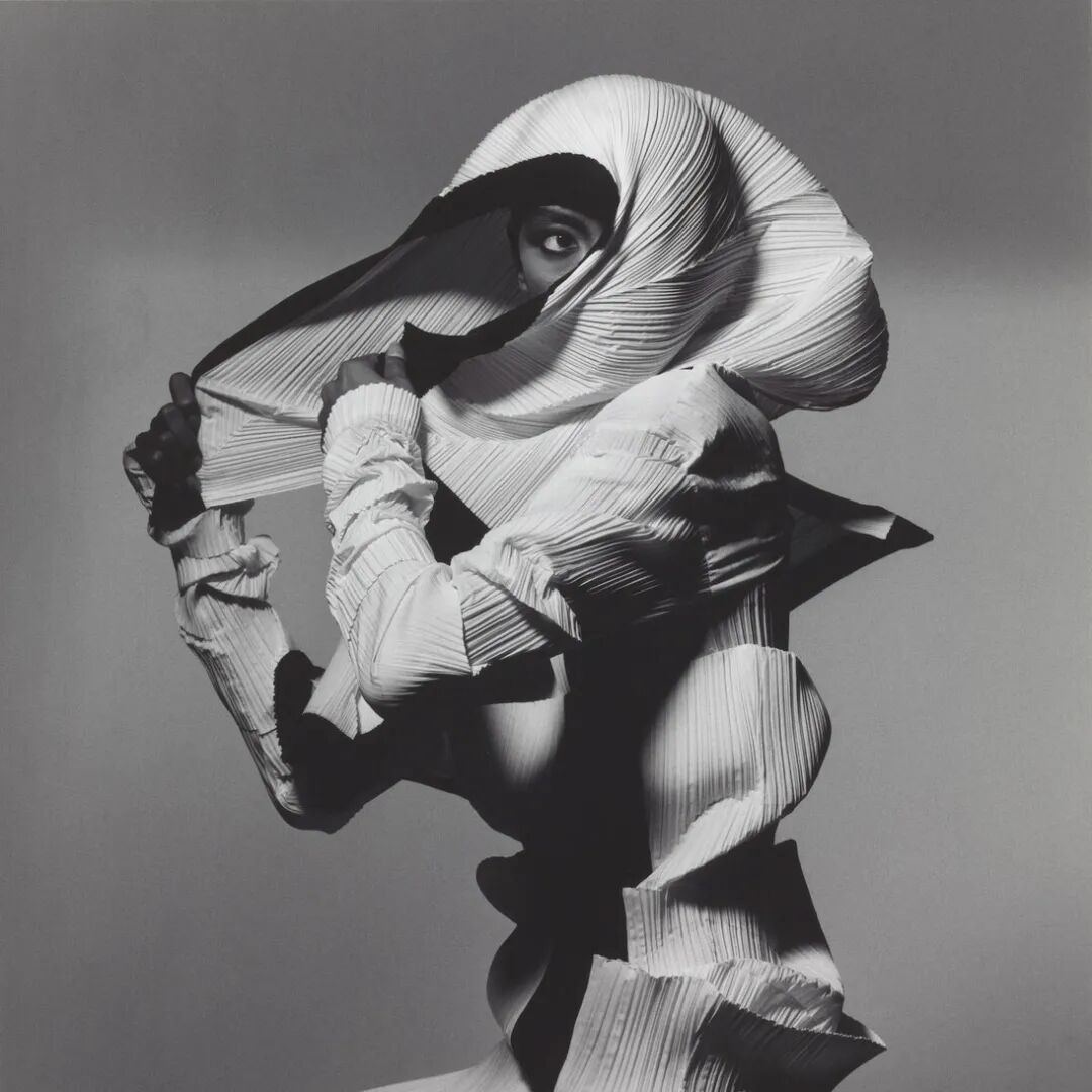 Irving Penn是三宅一生先生多年的搭档,他们1983年在一次Vogue拍摄现场相识,此后便长期合作目录、海报、书籍和广告大片。流传至今有超过250张的Issey Miyake视觉,都是来自Irving Penn的创作。