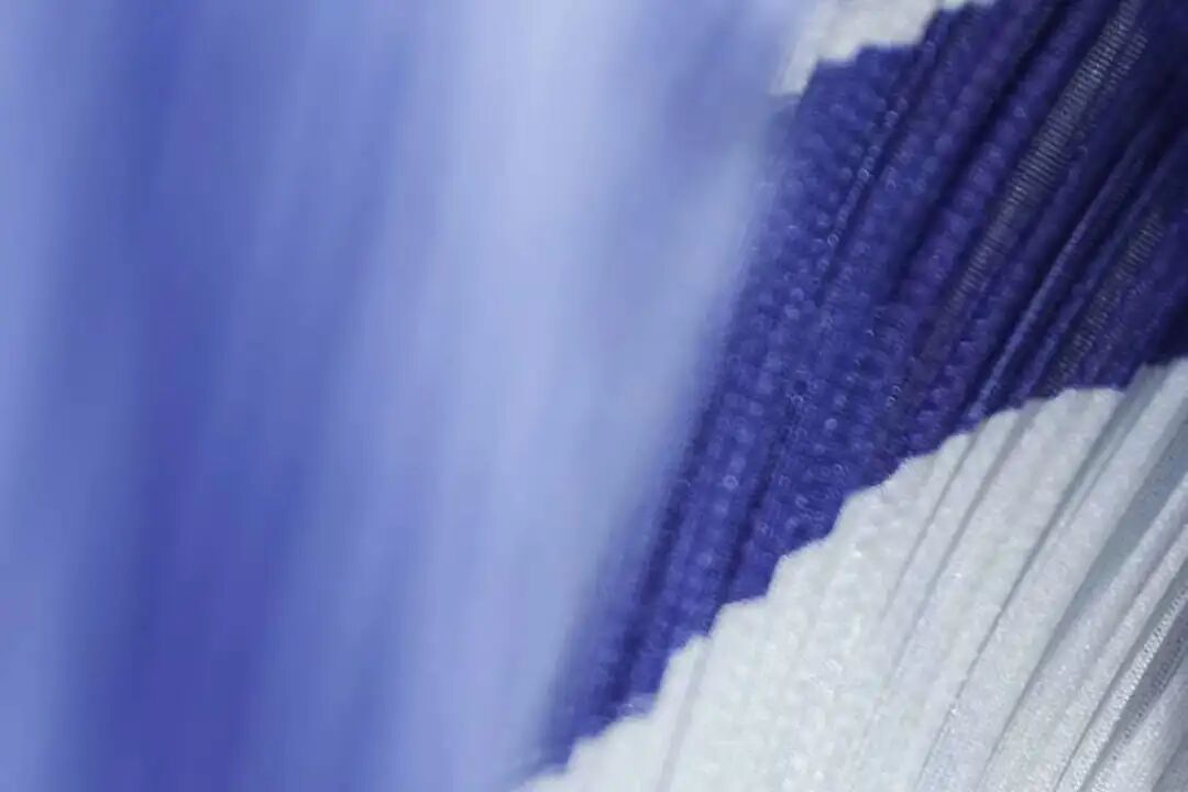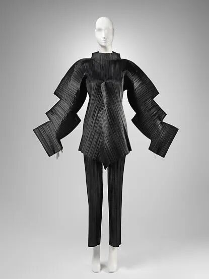 这件Pleats Please“楼梯”套装无论在廓形和面料研发上都有了新的突破——1993年,三宅一生先生在褶皱的基础上有了新的专利。他先以3倍尺寸的比例剪裁、缝制服装,再精准地折叠、熨烫后,将缝制的套装夹在纸之间,接着再放入压热机,最终形成永久褶皱。用几何形状包覆身体,无论什么样的身型,都将置身于具有弹性并随着动作和自由运动让面料延展的空间。