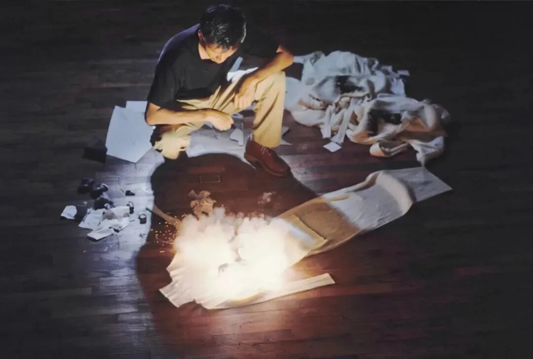 蔡国强先生在2006年写下:“一生让我天马行空地开始。我一度想做含药材的衣服,促进穿者身心健康,又曾大谈如何让使用者因为风水而运气更好。但最后都要面对服装的现实,比如能否经得起清洗…最终还是回到火药。当然火药也有问题:服装材料的化纤成分特别易燃,我想尽办法让它爆破后不会烧破,但最后无可奈何的破洞反而使我们的合作拥有非凡的特点。以至于印制的服饰也特意布上斑斑小洞的图样。”