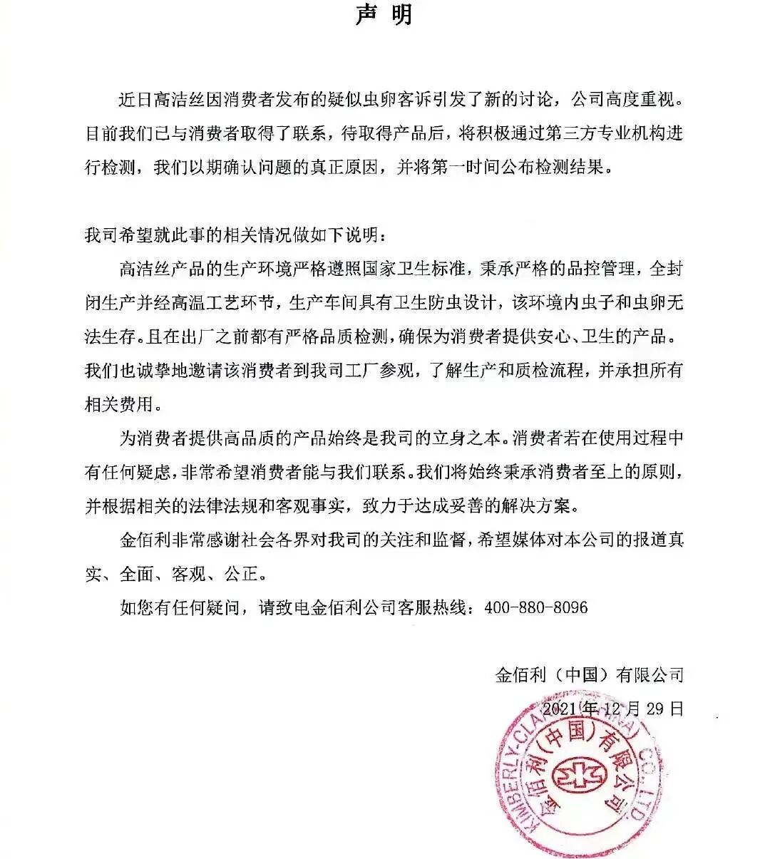 针对高洁丝卫生巾被爆有虫卵一事,高洁丝12月29日下午发布声明称,近日高洁丝因消费者发布的疑似虫卵客诉引发了新的讨论,公司高度重视。目前我们已与消费者取得了联系,待取得产品后,将积极通过第三方专业机构进行检测,我们以期确认问题的真正原因,并将第一时间公布检测结果。高洁丝还表示,高洁丝产品的生产环境严格遵照国家卫生标准,秉承严格的品控管理,全封闭生产并经高温工艺环节,生产车间具有卫生防虫设计,该环境内虫子和虫卵无法生存。(中国新闻网)