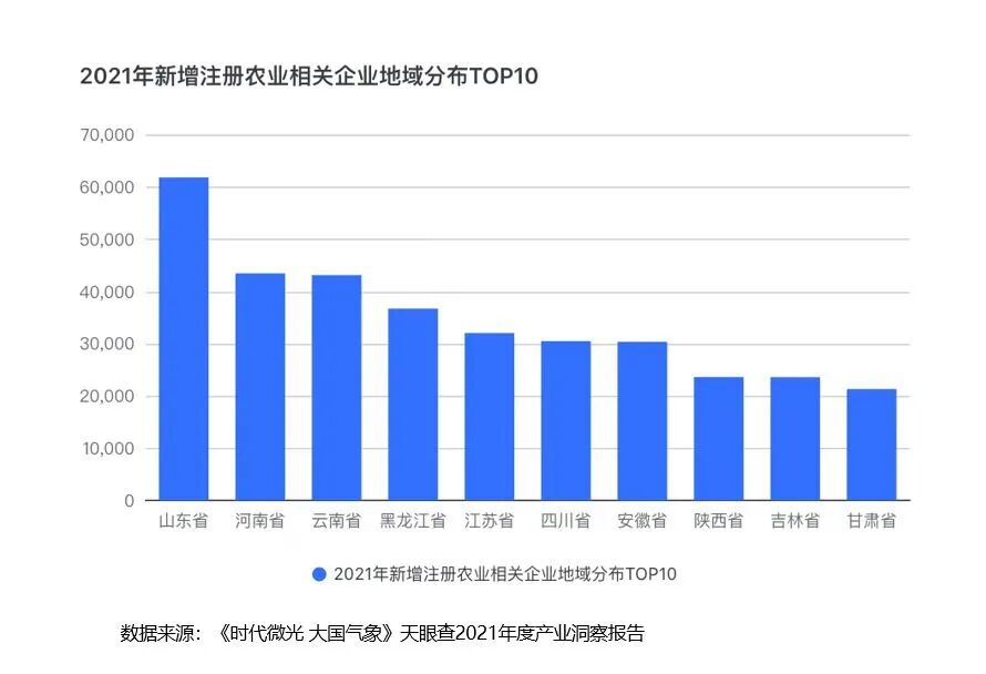 近日,天眼查数据研究院推出《时代微光 大国气象》2021年度产业洞察报告。报告显示,在农业领域,我国有超389万家农业企业,2021年新增53.6万家,同比增长16.2%,新增主要分布在山东、河南、云南、黑龙江等地;乡村电商更是迎来爆发,今年新增乡村电商相关企业124万余家,福建省新增企业数量全国第一,占比22.6%。