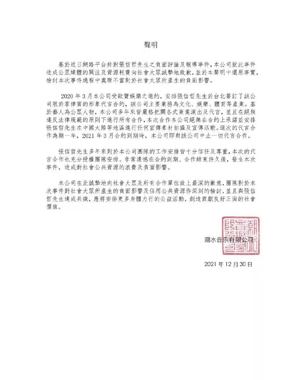 12月30日,张信哲经纪人发布潮水音乐有限公司(台湾)声明,先基于本次事件诚挚地道歉,称2020年3月公司受约签订了代言合约,合约限于菲律宾,该公司主要业务为文化、娱乐、体育等产业。称代言合作为期一年,2021年3月合约已到期,非常遗憾在合约到期、合作结束许久后,发生本次事件,造成对社会公共资源的浪费及负面影响。