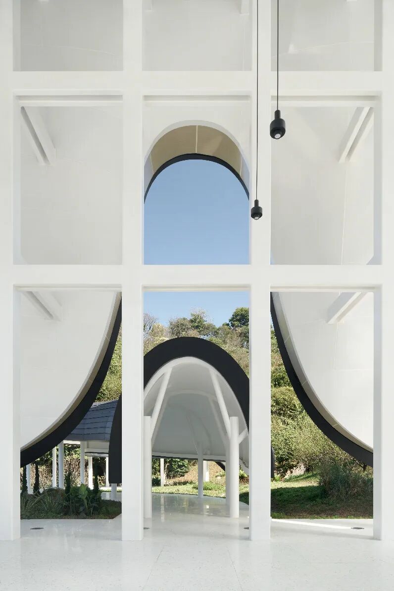 透过镬耳墙形的开窗中看去,深⾊的曲线屋⾯如同三⽚悬浮的帷幕在空中飘舞 。屋⾯下的结构为⽩⾊,从东⻄侧看,内部的⽩⾊结构⼏乎“隐形” 。