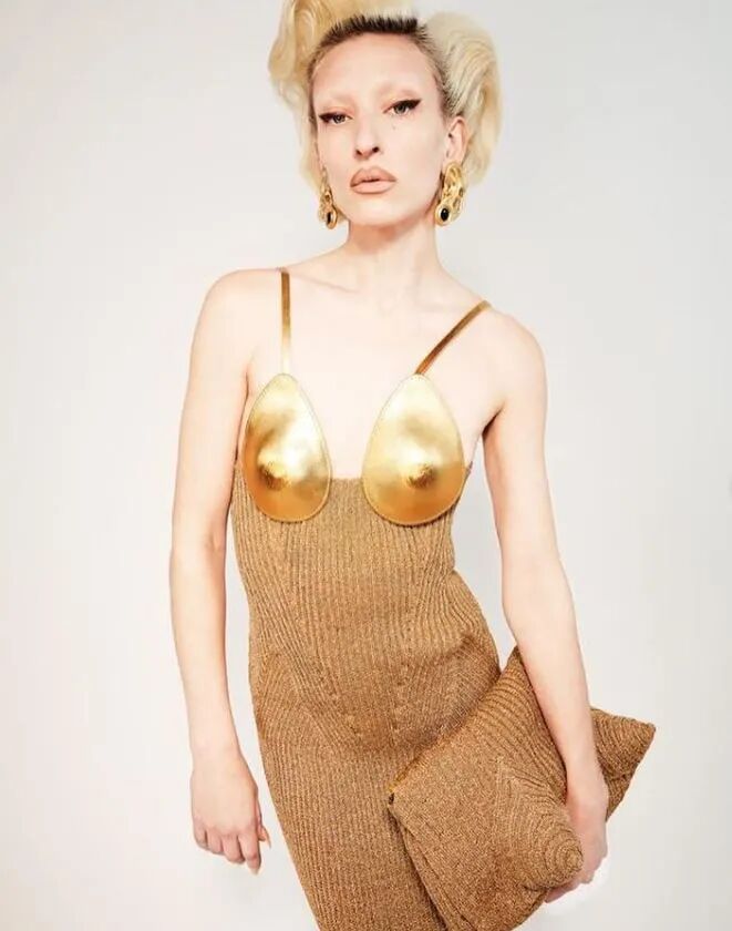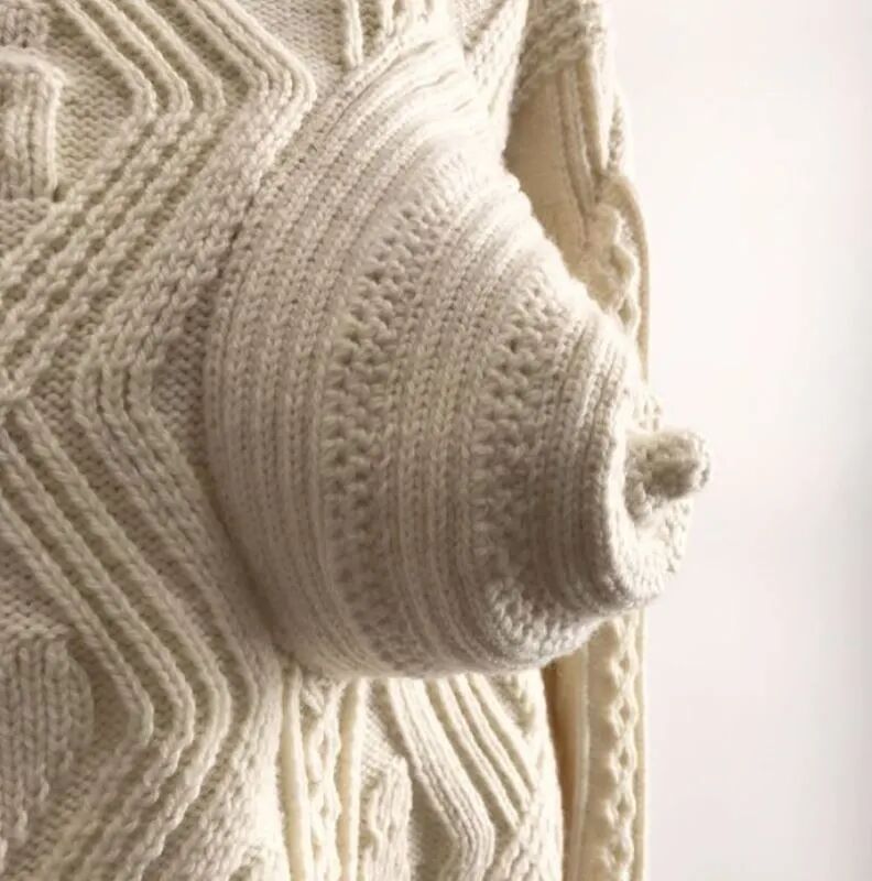 Cécile Feilchenfeldt 的一些针织作品中将女性特征——乳房这一元素融入其中,模仿乳房的形态进行造型设计,优雅而感性,将女性的美感运用针织造型表现得淋漓尽致。