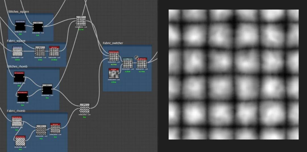 从一些参考中我们能看到在羽绒服材质上,有很多种不同的图案。我决定创建最常用的三种:条状、方块状和菱形状。我添加了Multi Switch node在这些图案中进行选择