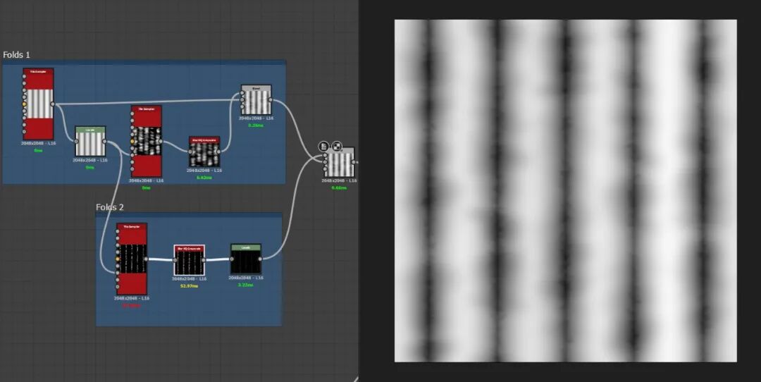 利用Levels node,我可以控制褶皱的形状;利用Blend node的透明度参数可以控制每一种褶皱的深度