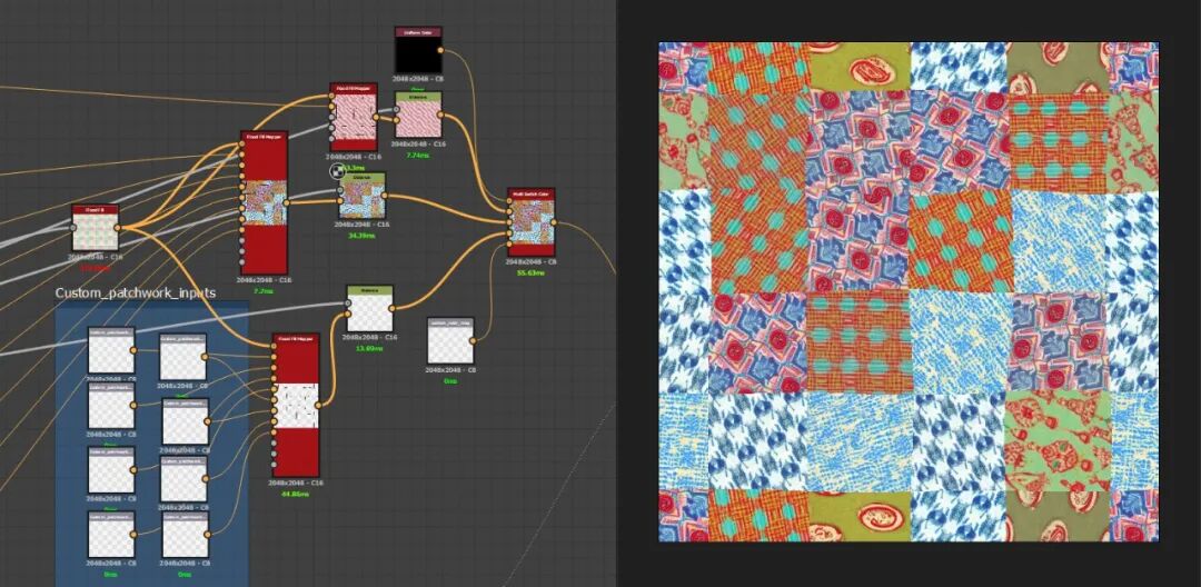 颜色图。该阶段的材质制作,我觉得采取拼布方式。我用Flood Fill Mapper node去拼合不同部分的布料,为了空隙我创建了Distance node