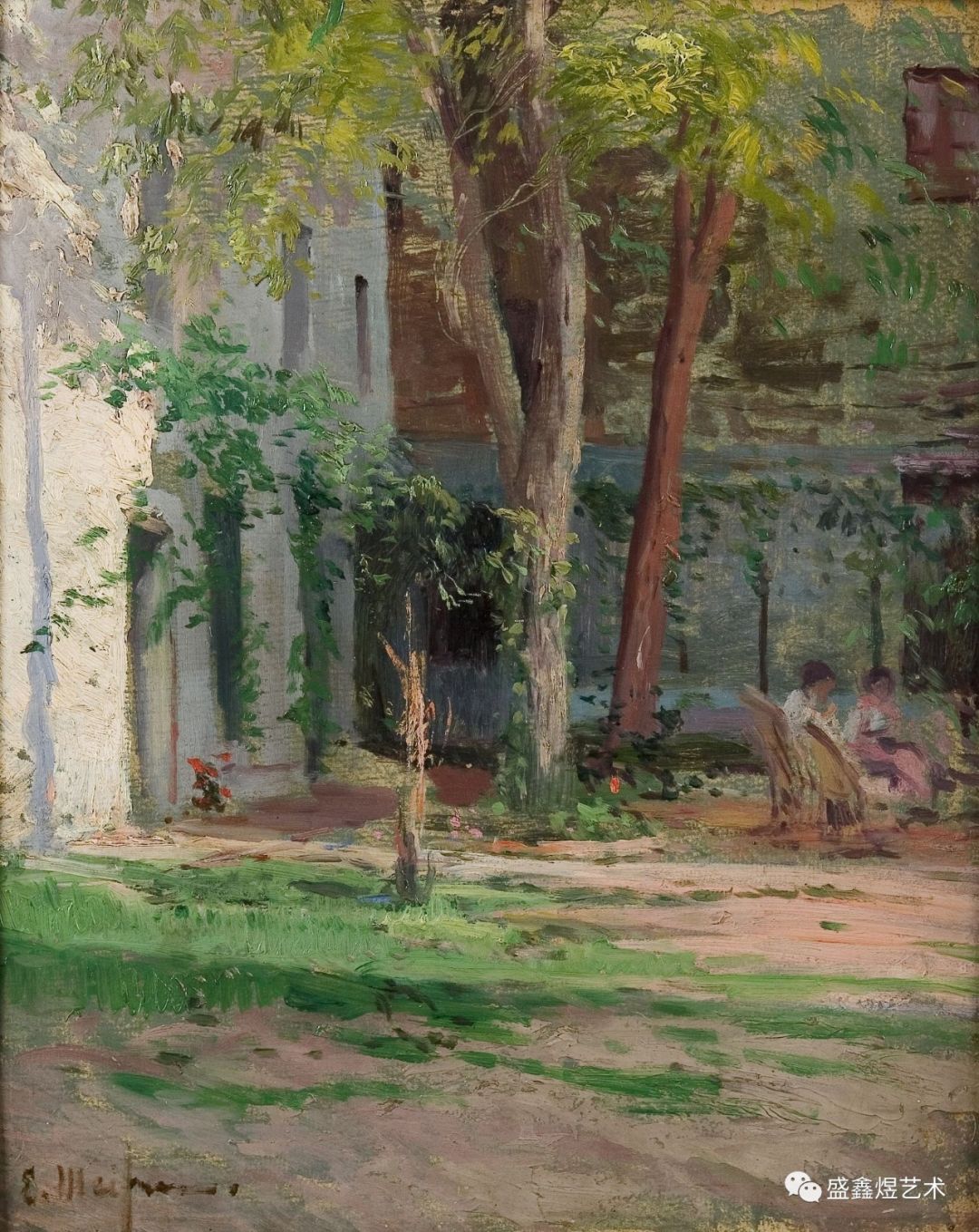 埃利塞奥·梅夫雷恩出于对艺术的热情,他放弃了医学研究,并就读于Escola de la Llotja,他的老师是Antoni Caba和Ramon Martí Alsina。1879 年,他前往巴黎,通过出售小幅油画和城市景观草图来支持他的学业。然而,他的风格受到了一次短暂的意大利之旅的决定性影响。1881年回到西班牙后,他参加了全国美术展览。
