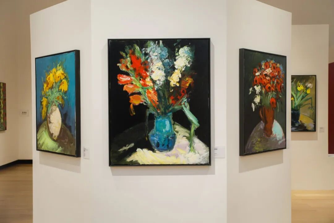 ▲ 乔尔达在《色彩的探索—法国当代绘画展》中的参展画作,从左至右:《向日葵》,《唐菖蒲花》,《虞美人花》,《白色和黄色的鸢尾花》
