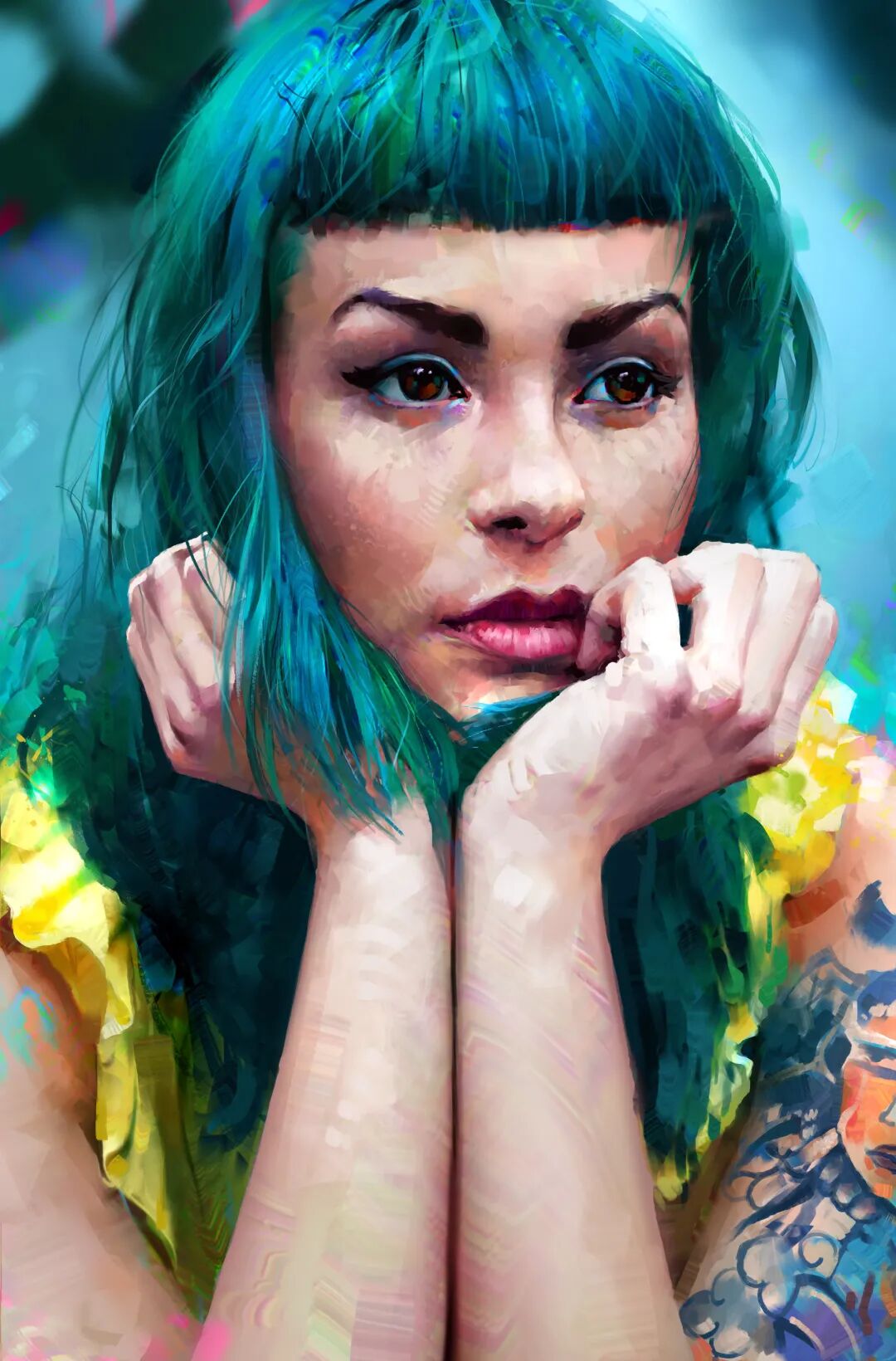 Aaron Griffin对于色彩的巧妙运用堪称炉火纯青,看似凌乱的铺色和笔触组成了超写实的人物肖像,用色的过渡非常厉害,呈现出油画般的细腻质感。