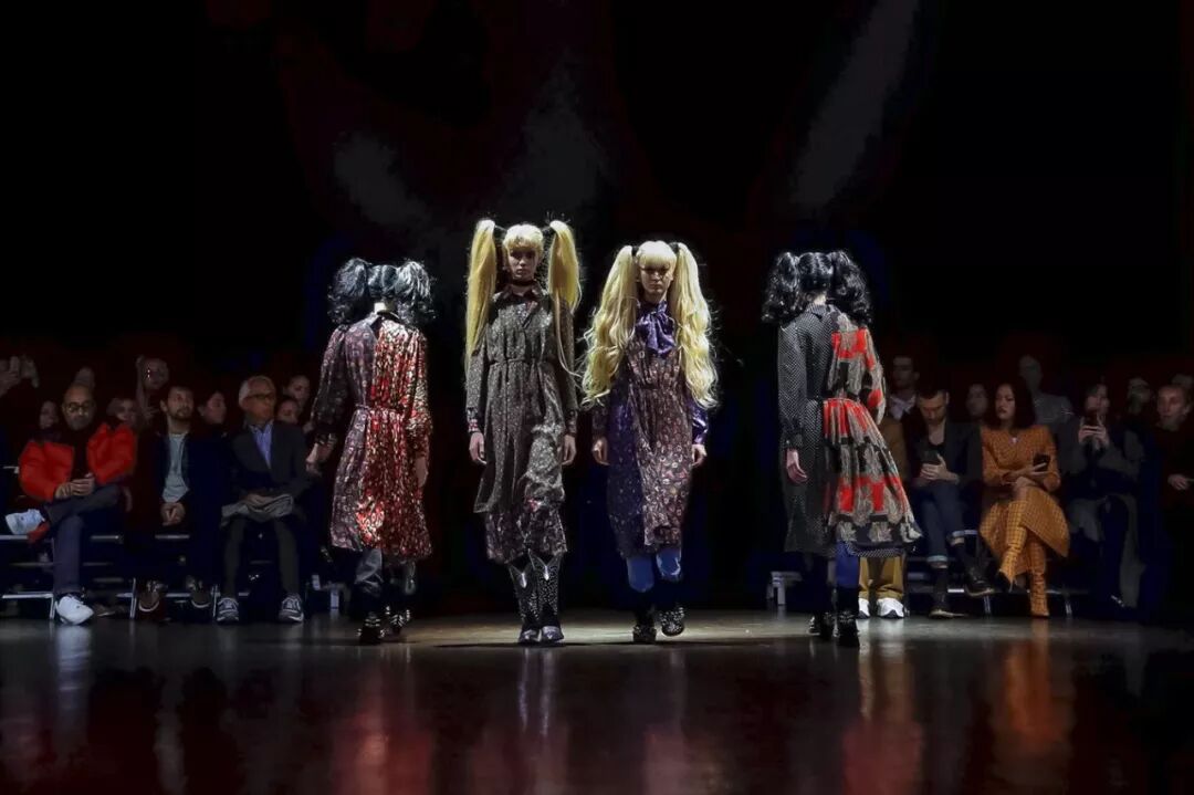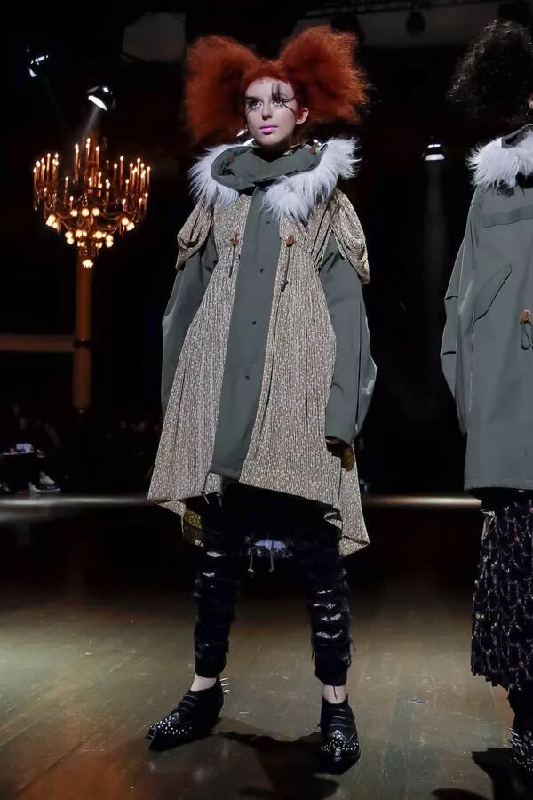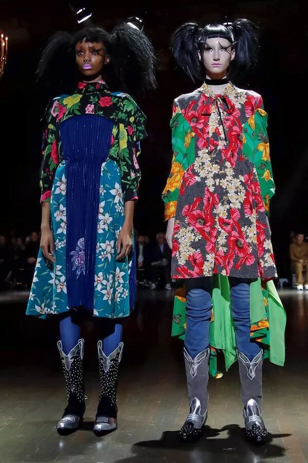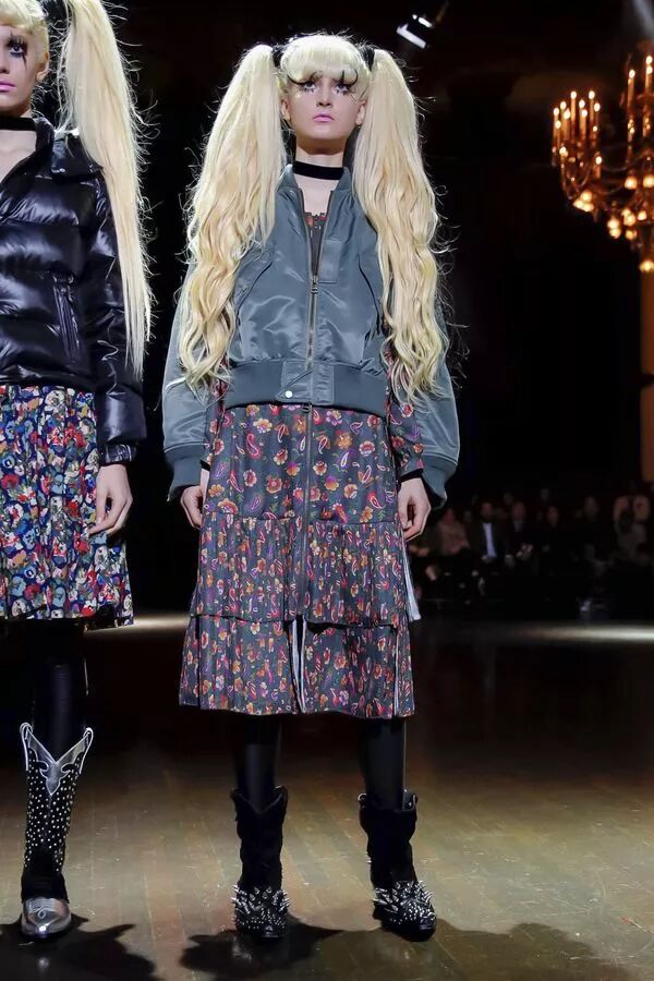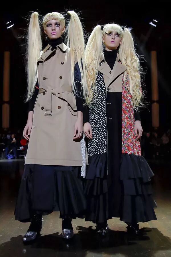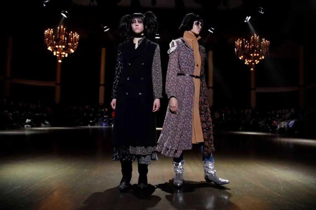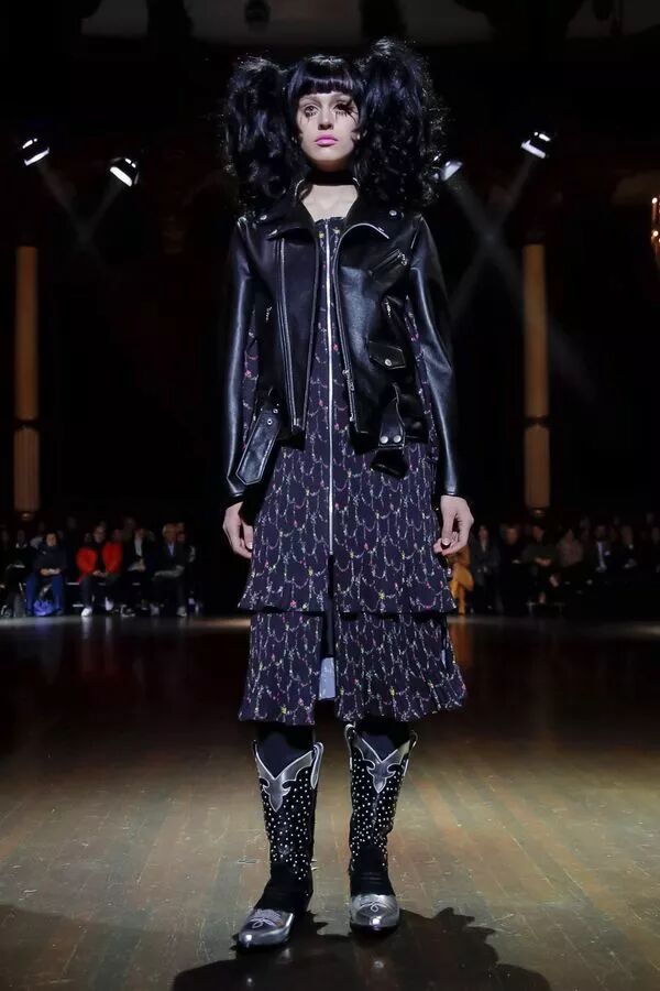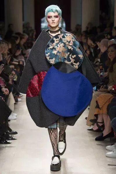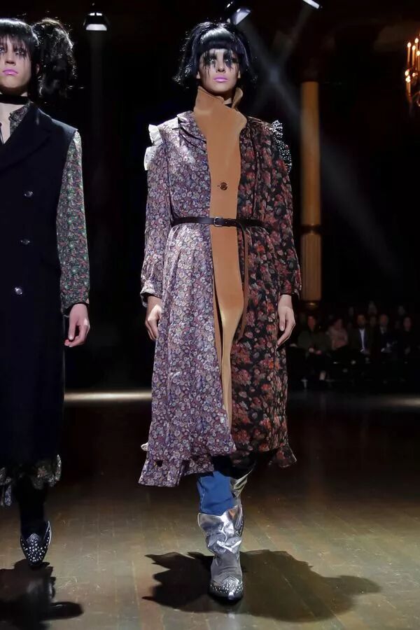 Junya Watanabe 2019秋冬系列是实用主义与趣味性结合的一季,延续了Junya Watanabe拼贴风格,将碎片印花图案被重新组装成粗布补丁,搭配着各式样的靴子。歪斜的大长假睫毛,粉红芭比口红,用涩谷风造型打造出的个性十足的形象,芭比形象甚至有些恐怖,配合切碎的花卉图案和阴郁的气氛,别有一番韵味。