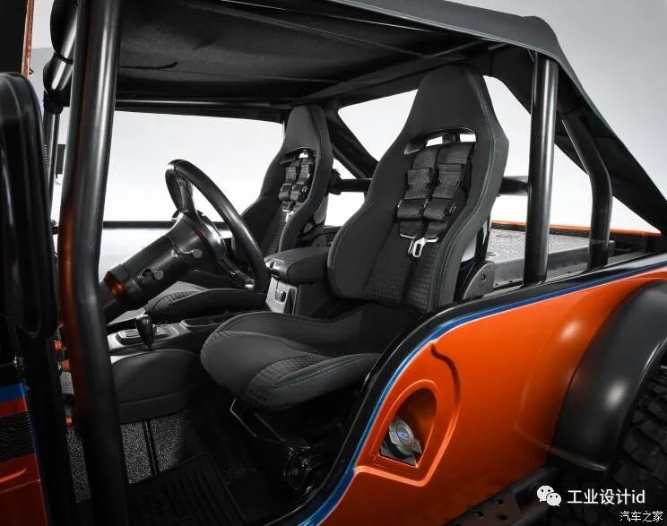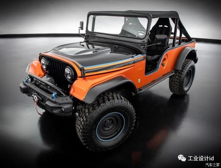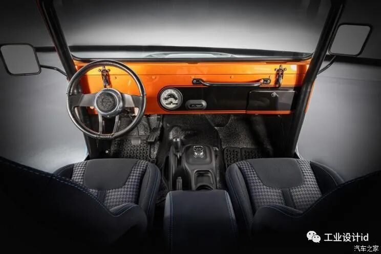车身配色方面,新车采用了亮眼的橙色车身设计,并在细节处融入了更加多样化的配色方案,起到了非常不错的点缀作用,同时,我们还可以在前翼子板处发现EV标识,彰显出新车的不同之处。进入车内,和我们印象中的概念车不太一样,新车采用了简约且复古的设计,一切与驾驶、越野无关的配置似乎都不会出现在车内。