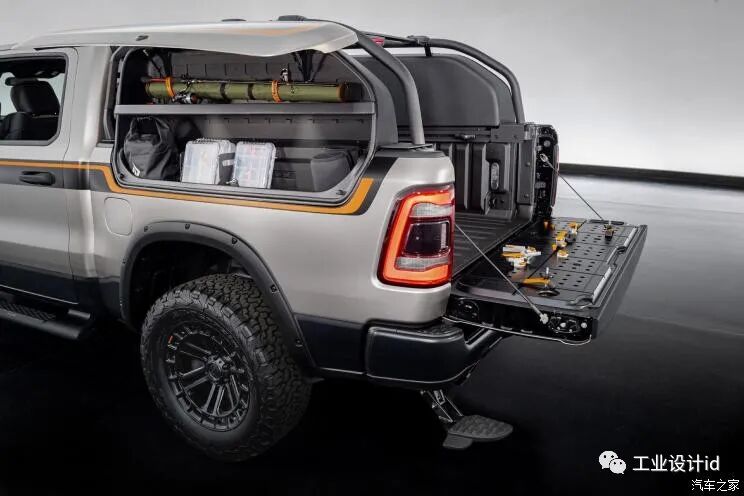 如果说,RAM 1500 TRX Gold Shot向我们展现出了顶级的越野性能,那么,RAM 1500 Backcountry X则想要凸显自身的“空间管理”能力。可以看到,新车从侧面看上去就像是一台SUV车型,不过来到尾部我们发现,新车只是在尾厢两侧额外加装了储物装置,据悉,该套装置的出现能够让车内的安全存储空间扩大68%以上。