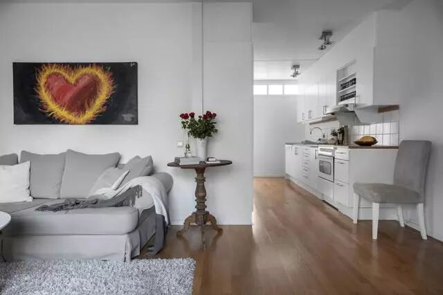 客厅后的过道上,半开放式的厨房,似乎不是单独的存在,像是过道上临时增加的。然而这一切都不妨碍家具的动线跟使用。角落里的边桌、椅子,尽管是随手一放,但它们的存在也添加了不同的色彩与韵味。