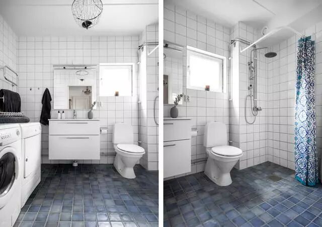 玄关旁的大卫生间,蓝色系的地砖,配合着浴帘,视觉上有延伸且有一定的浪漫元素。既然有那么的位置,不搞点洗衣机、烘干机放这里有点浪费了。吊灯要装,镜前灯也要装,以保证使用镜子的人都能看到最真实、最清楚的自己。