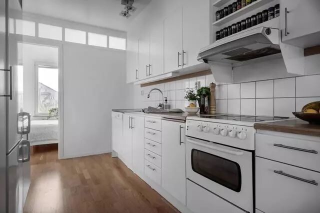值得一提的是,考虑到厨房的采光问题,后方的卧室墙上特意加了一道玻璃透光,让厨房不那么的暗淡、压抑,且多赋予了一层神秘感。还有油烟机上方的橱柜,直接换成开放式的隔板,摆放着各种瓶瓶罐罐的调料,烹饪时会更加的方便。
