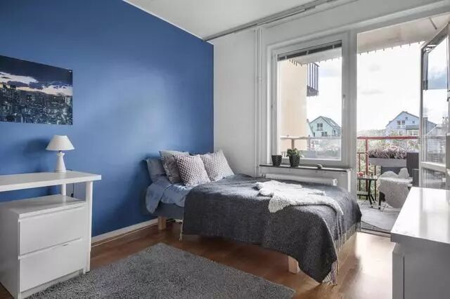 隔壁的一间比较大的卧室,刷的蓝色背景墙,偏中性可以随便男女共用,不被任何的条框所束缚着。屋外还带一个小露台,傍晚、周末捧着酒来这里喝一杯或是畅谈放松放松,也是惬意的很。