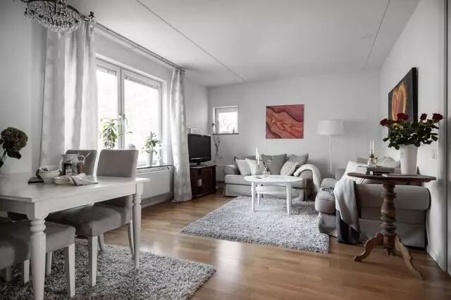 玄关外的客餐厅,果真被家人猜对了,有点小;但这也是有原因的,因为屋主一意孤行的多加了一堵墙,目的就是为了给卧室再来一个衣帽间。客餐厅内,用简单的地毯划分着标记,简简单单,不以多色彩装饰。