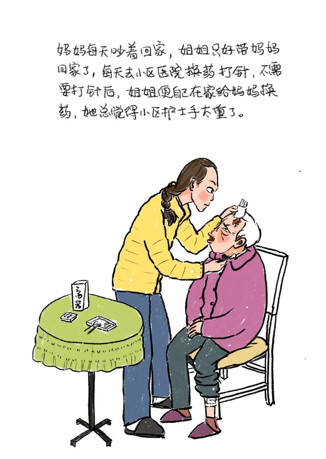 阿尔茨海默这个题材的书在国内其实不缺了,但是用绘画和“对画”的形式这应该是第一个。亦邻的书里有足够丰富的内容,一圈一圈地嵌套在一起,最里层是三个女儿照顾阿尔茨海默病的母亲,再往外延是长期的家庭照护,第三层是代际关系,最外层是所有人都要面对的衰老和死亡命题。
