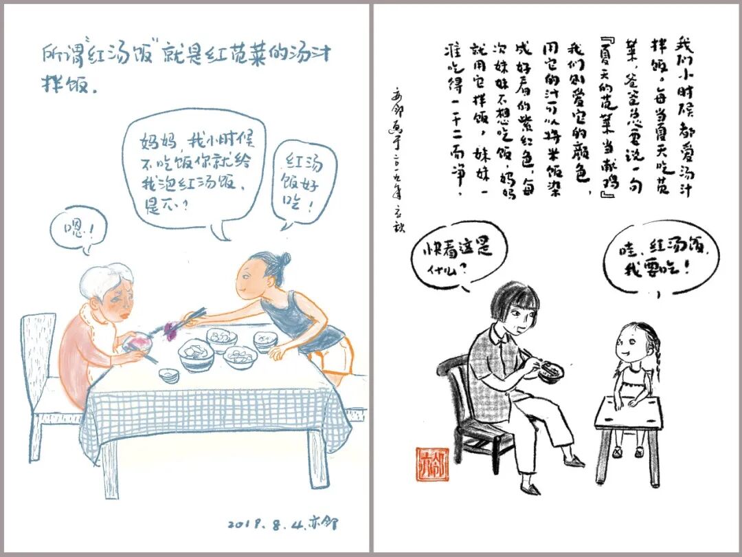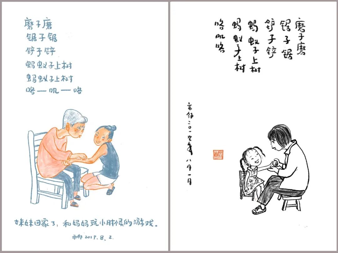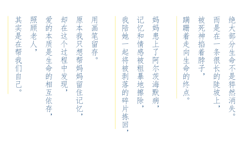 作为一名插画师,亦邻试图用绘画帮妈妈抵御遗忘、留存记忆。看到妈妈被画里以前的场景唤起回忆,开口说出“我还记得”,亦邻深受触动,于是坚持每天给妈妈画一幅画,画爸爸妈妈相亲相爱的时光,画三姐妹小时候的故事,画妈妈曾经的理想…… 亦邻还鼓励妈妈拿起画笔作画,妈妈有时临摹亦邻的画,有时也写生,画家里的花花草草;心情好时,也提笔创作,画下三姐妹小时候的肖像;阿尔茨海默病患者的涂鸦,笨拙、扭曲、凌乱,但亦邻看到了艺术给精神世界日趋荒芜的妈妈带来的改变,这鼓舞她一路坚持画了下来,她把这个系列的绘画命名为“唤醒妈妈的记忆”。