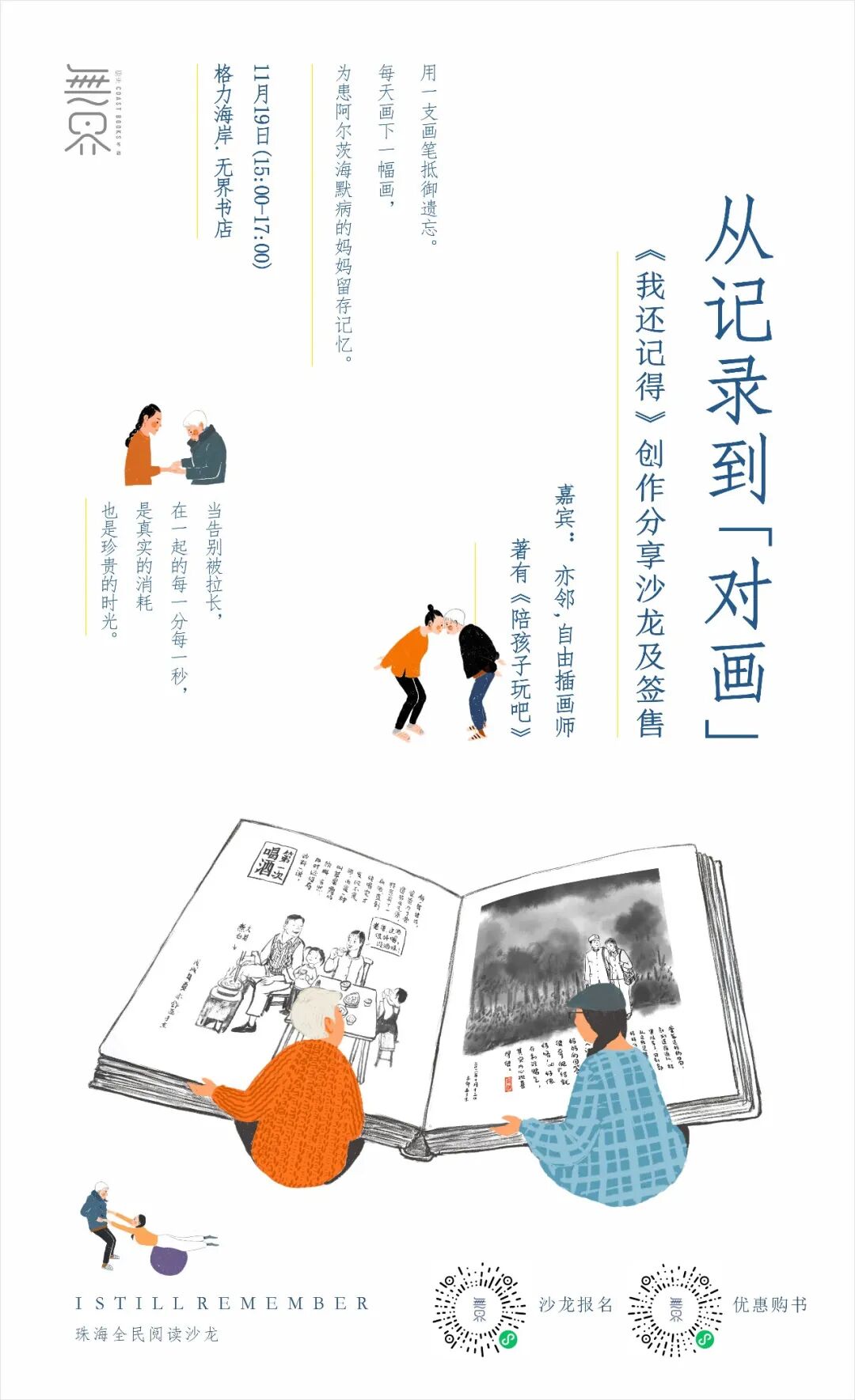 冲击之下,自由插画师亦邻关于「意义」的命题第一次跳出近五十年的生命体验中。父亲离世后,亦邻拿起画笔,记录三姐妹一起照顾母亲的艰难时光,记录父母的爱情故事、一家人的过往。 11月19日,她带着《我还记得》,带着他们全家人的疗愈之路,与无界的读者们一起来探讨,生命的意义。