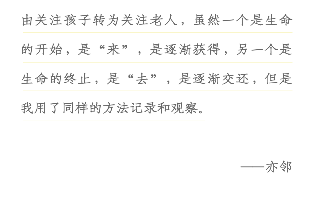 同时,在照顾妈妈的过程中,那些不断跳出来的「意义」命题,也渐渐在「原路返回」的过程中有了答案。亦邻觉得,对意义和价值的思考是没有结果的,它不断地在升华。会渗透在你怎么对待家人、怎么对待生命之中。要不断去探索,走到这一步才知道会遇到什么,还有什么东西在前面等着你。也因为没有标准答案,所以过程是美妙的。思考意义的过程,就是意义本身。
