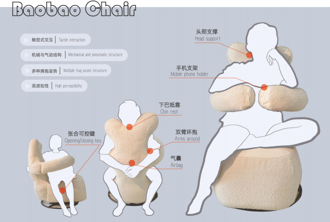 抱抱椅以情绪调节类型中的“拥抱法”为切入点,面对情感需求,以互动的的形式带给用户“拥抱”,以情景共情重建家具交互新角色,引领家具设计新潮流。